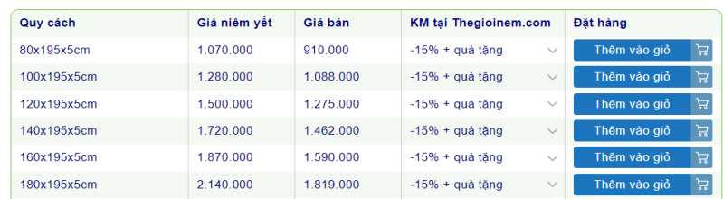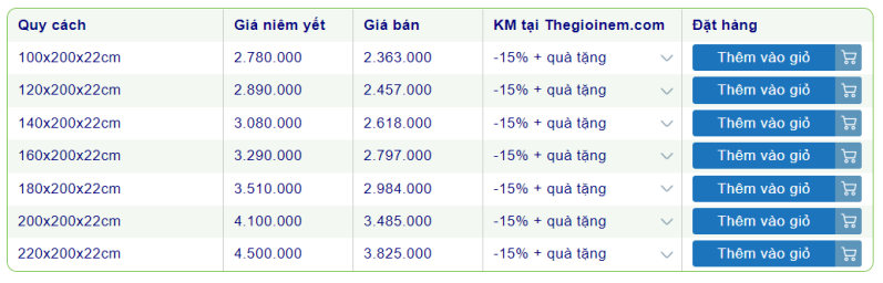 Nệm Vạn Thành 15cm giá bao nhiêu?