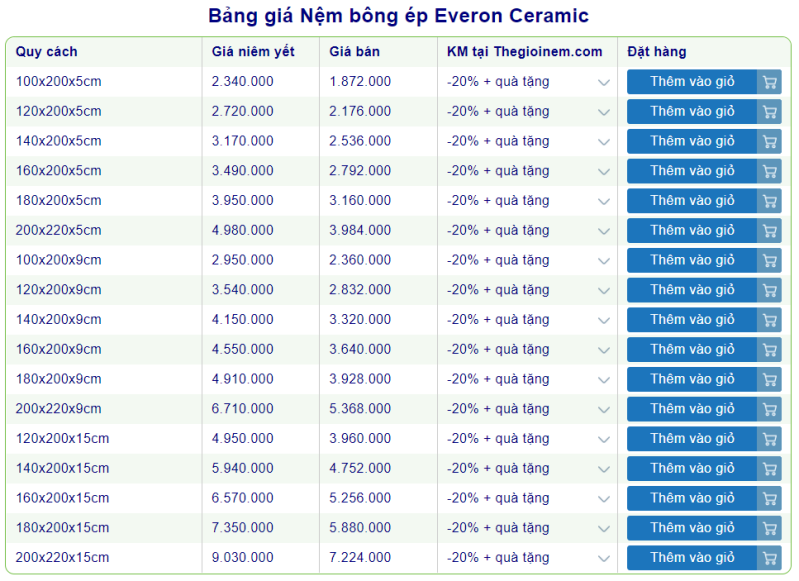 Everon là thương hiệu nệm lớn được nhiều khách hàng lựa chọn tin dùng, là 1 trong những dòng nệm được phân phối bởi thế giới nệm. Bên dưới là bảng giá nệm everon mới năm 2022 cùng nhiều khuyến mãi quà tặng hấp dẫn. Hy vọng sẽ giúp khách hàng nắm rõ hơn về giá cũng như những chương trình khuyến mãi của nệm everon để mua sắm thuận tiện hơn.