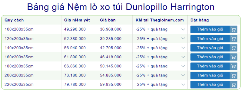 2. Bảng giá nệm lò xo túi Dunlopillo