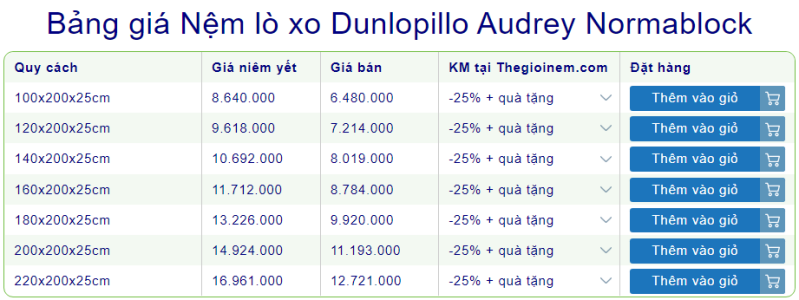 1. Bảng giá nệm lò xo liên kết Dunlopillo