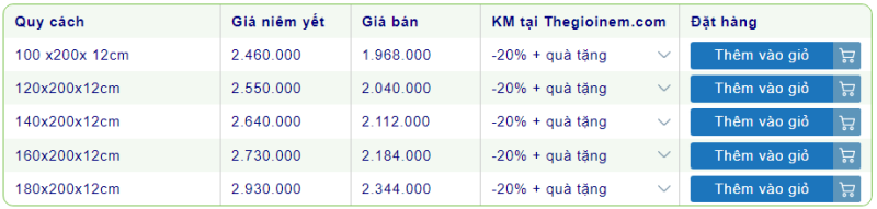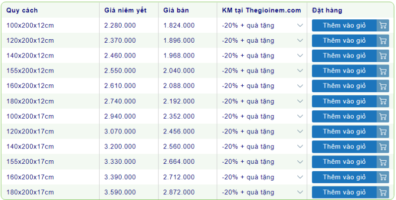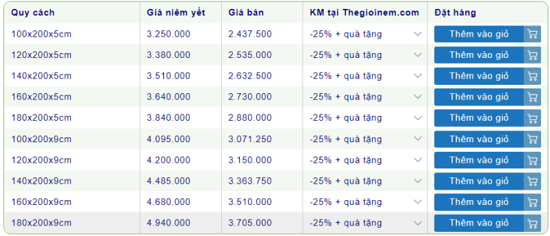 Khách hàng có thể tham khảo bảng giá nệm bông ép Kim Cương mới nhất để biết được những ưu đãi hiện có tại Thegioinem.com và lựa chọn sản phẩm phù hợp dễ dàng hơn.