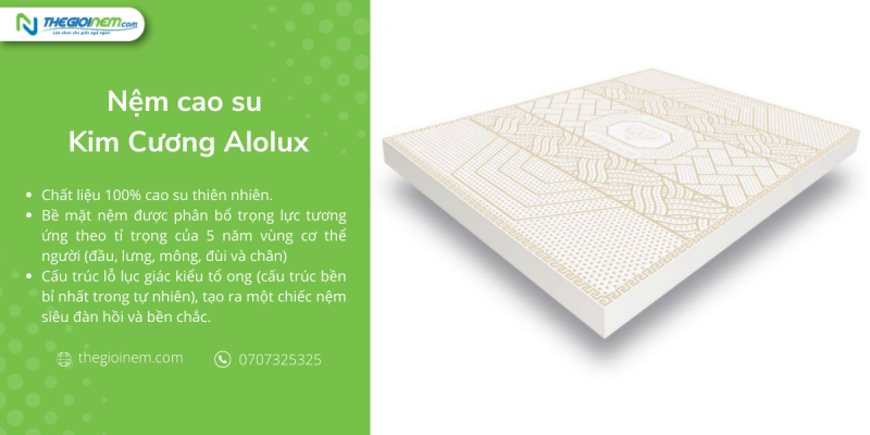 Nệm cao su Kim Cương có cấu trúc lỗ lục giác kiểu tổ ong đây được xem là cấu trúc bền bỉ nhất trong tự nhiên, tạo ra một chiếc nệm siêu đàn hồi và bền chắc. Nệm thông minh hiểu được từng chuyển động của cơ thể, nâng đỡ đa vùng mang đến cảm giác thoải mái nhất khi ngủ. Đặc biệt hơn, áo nệm làm từ vải gấm xốp nhập khẩu của Bỉ cùng công nghệ chiết xuất vượt trội tinh chất lô hội trong vải áo nệm giúp dưỡng da, mềm tóc bảo vệ sức khỏe gia đình bạn.