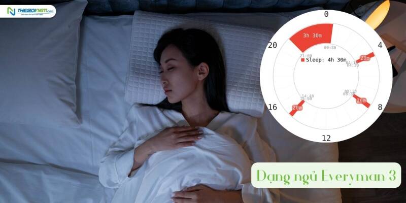 Biến thể 3 trong phương pháp ngủ everyman giảm thời gian xuống còn khoảng 4 giờ hoặc 4 giờ 30 phút. Trong đó sẽ có 1 giấc ngủ chính và 3 giấc ngủ ngắn. Giấc ngủ chính bắt đầu vào khoảng 9 giờ tối, 2 giấc ngủ ngắn bắt đầu lần lượt vào lúc 4 giờ sáng và sau khi mặt trời mọc. Một giấc ngủ ngắn cuối cùng sẽ xảy ra vào khoảng 2 giờ 20 phút tối. Phương pháp ngủ ở giai đoạn này có mức tương đối khó, vì vậy các bạn cần phải kiên nhẫn để đạt được.