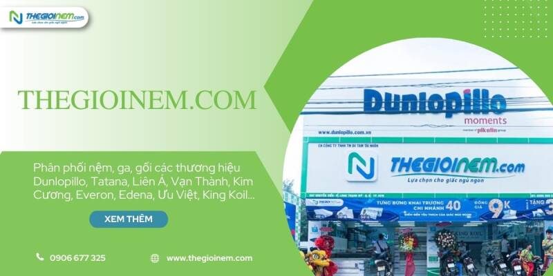 Hợp tác được với Dunlopillo hơn 12 năm, Thegioinem.com là nơi mua sắm nệm lò xo chuẩn Châu Âu với giá thành hợp lý. Kênh phân phối phủ sóng rộng khắp các tỉnh thành từ bắc tới nam, cam kết giao hàng toàn quốc để nhà nhà đều có thể tận hưởng giấc ngủ ngon cùng những sản phẩm chất lượng.