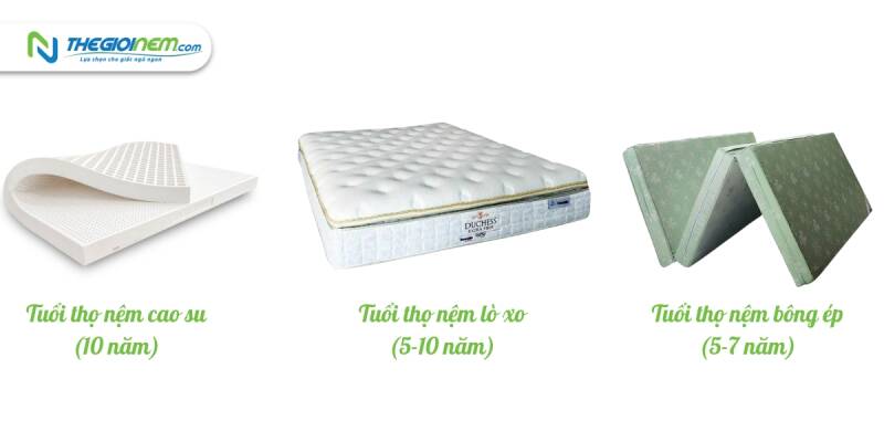 Nhưng nhìn chung, một chiếc nệm cao su chất lượng thường có tuổi thọ rất cao, khoảng 10 năm sử dụng. Đặc biệt với một số sản phẩm nệm cao su thiên nhiên tích hợp công nghệ cao thì tuổi thọ có thể trên 10 năm và thậm chí là 20 năm nếu biết cách sử dụng và bảo quản đúng cách.