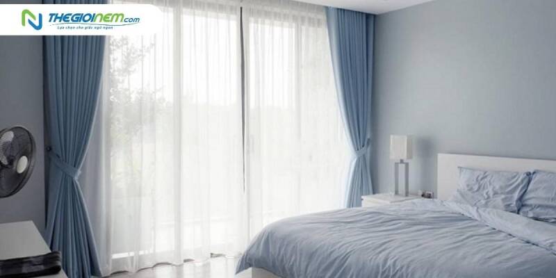 Rèm cửa sổ có thể giúp che chắn ánh nắng mặt trời và giữ nhiệt độ trong phòng ngủ không tăng lên quá nhiều. Bạn hãy chọn loại rèm có chất liệu chống nhiệt để tăng khả năng cản nhiệt và cản sáng. Bên cạnh đó, bạn nên lựa chọn rèm có màu sắc trang nhã không quá chói vì màu quá nổi bật sẽ tạo cảm giác nóng nực cho căn phòng.