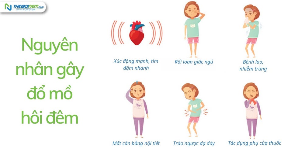 - Trào ngược dạ dày - thực quản: Mặc dù ợ nóng là triệu chứng chính, nhưng đổ mồ hôi đêm cũng rất phổ biến ở người có bệnh dạ dày.