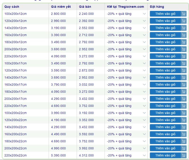 Bảng giá các loại nệm cao su giá rẻ tại Thegioinem.com
