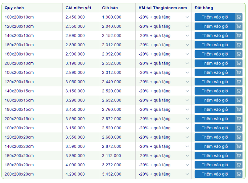 Bảng giá các loại nệm cao su giá rẻ tại Thegioinem.com