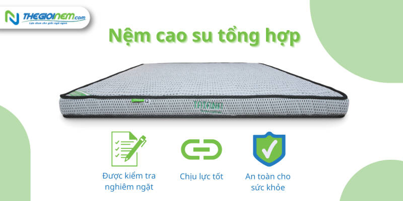Nệm cao su tổng hợp có cấu tạo từ các nguyên liệu tổng hợp bao gồm cao su thiên nhiên, mút ép,... được xay nhuyễn và ép chặt thành những tấm nệm theo từng kích cỡ của khuôn đúc. Chất liệu tổng hợp này có đặc tính cơ học, chịu lực cao và không bị biến dạng theo thời gian.