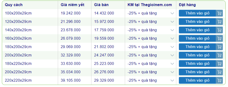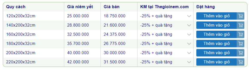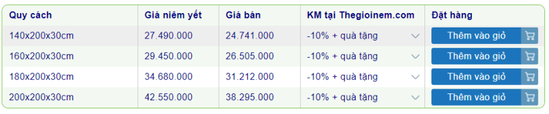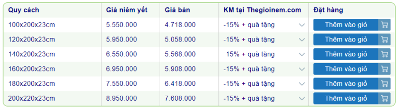 Giữa muôn vàn các dòng nệm, thương hiệu nệm khác nhau, khách hàng thường gặp khó khăn trong việc đưa ra quyết định. Do đó, Thế Giới Nệm đã tập hợp bảng giá nệm lò xo được ưa chuộng nhất để khách hàng dễ dàng tham khảo và chọn mua: