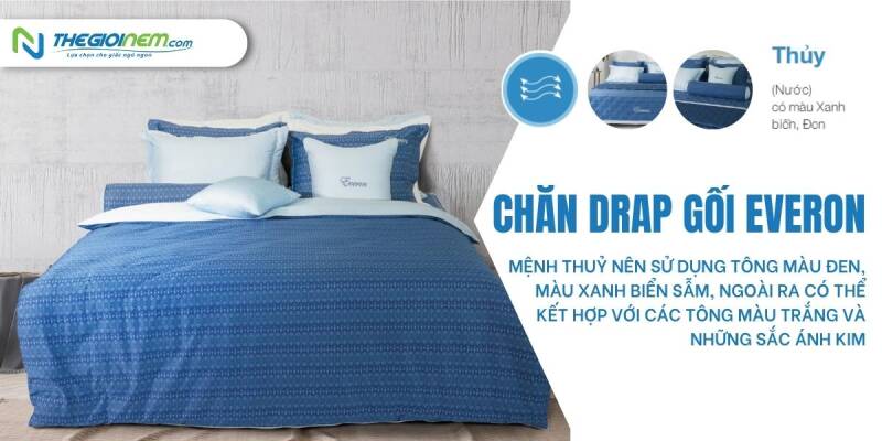 - Màu tương sinh: Thuỷ (nước): màu xanh biển sẫm, màu đen. Bạn mệnh Thuỷ nên sử dụng chăn ga gối nệmtông màu đen, màu xanh biển sẫm, ngoài ra có thể kết hợp với các tông màu trắng và những sắc ánh kim cũng sẽ rất hợp với bản mệnh của bạn đấy vì Kim sẽ sinh Thủy.